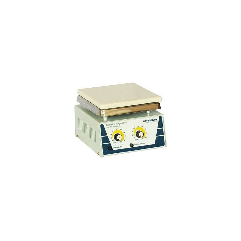 Agitador magnético com aquecimento e capacidade de agitação até 10 litros.