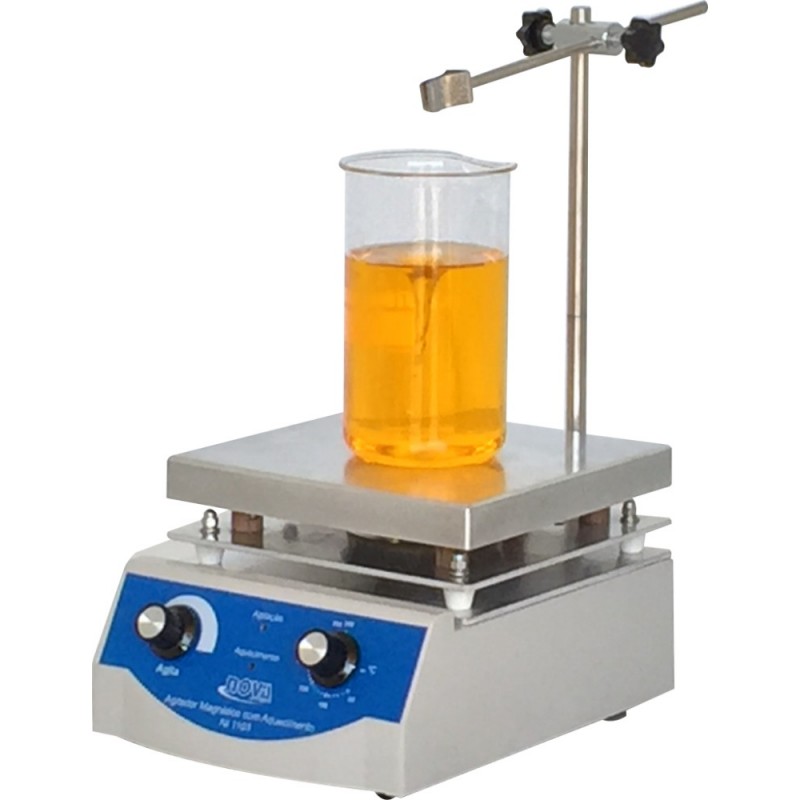 Sua estrutura, construída em gabinete de aço carbono, com pintura eletrostática em epóxi é resistente a agressões químicas, enquanto que a plataforma é construída em pirocerâmica esmaltada. Equipado com uma chave liga/desliga lateral e painel de comandos frontal em policarbonato, com Knobs de ajustes individuais independentes para agitação e aquecimento e duas lâmpadas sinalizadoras (piloto) de funcionamento, uma para cada função. Excelente uniformidade de temperatura em toda superfície da placa. Equipados com uma prática haste para poder suportar termômetros, uma sonda de pH, ou outro dispositivo qualquer.