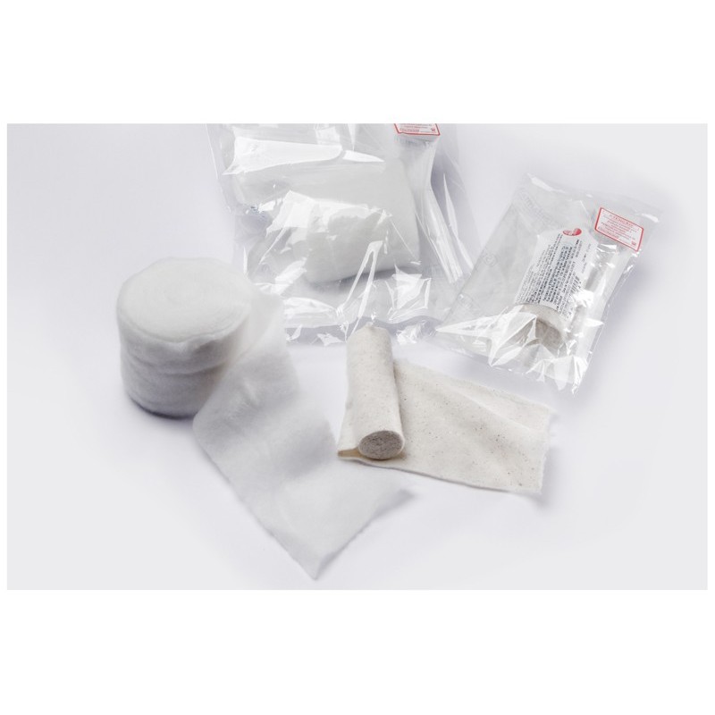 Fibras de algodão cru prensado e laminado. Envelope grau cirúrgico com 01 unidade. Comprimento 1,8m e larguras 6, 8, 10, 12, 15 e 20cm. Esterilizado em Radiação Gama.