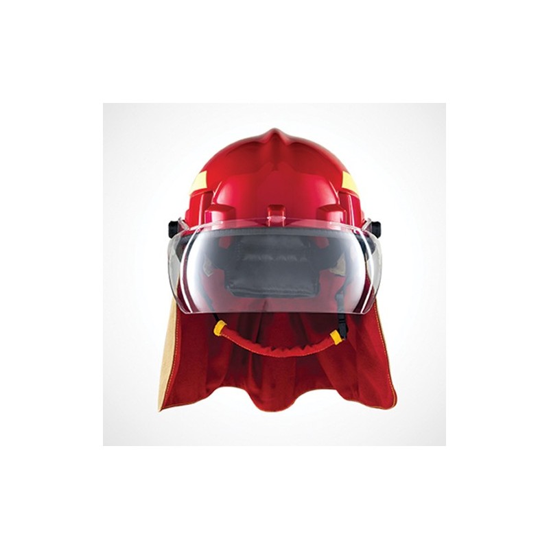 Quebra-telha em relevo com desenho anatômico que permite a colocação de adesivos particulares do bombeiro Faixas refletivas em formas trapezoidais fixadas nas laterais do capacete Aba em toda sua lateral e frontal, tornando-se maior na parte traseira para evitar que produtos e água possam cair dentro da vestimenta;