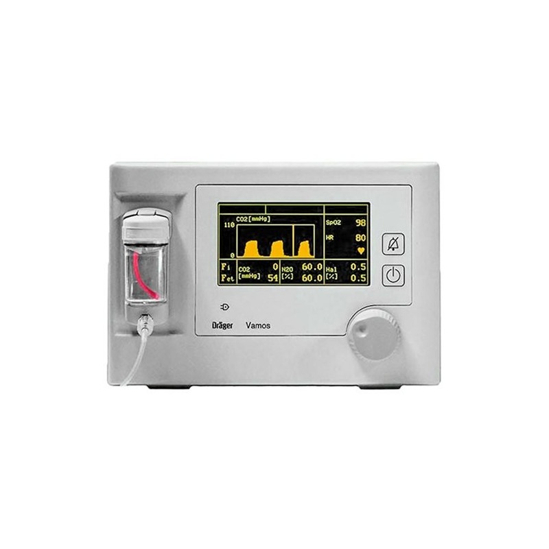 O Drager Vamos é um monitor de gás anestésico variável usado para medir e monitorar a concentração de CO2, a saturação funcional de oxigênio, a taxa de pulso e as concentrações de N2O e os seguintes agentes anestésicos voláteis: Halotano, Enflurano, Isoflurano, Sevoflurano e Desflurano.