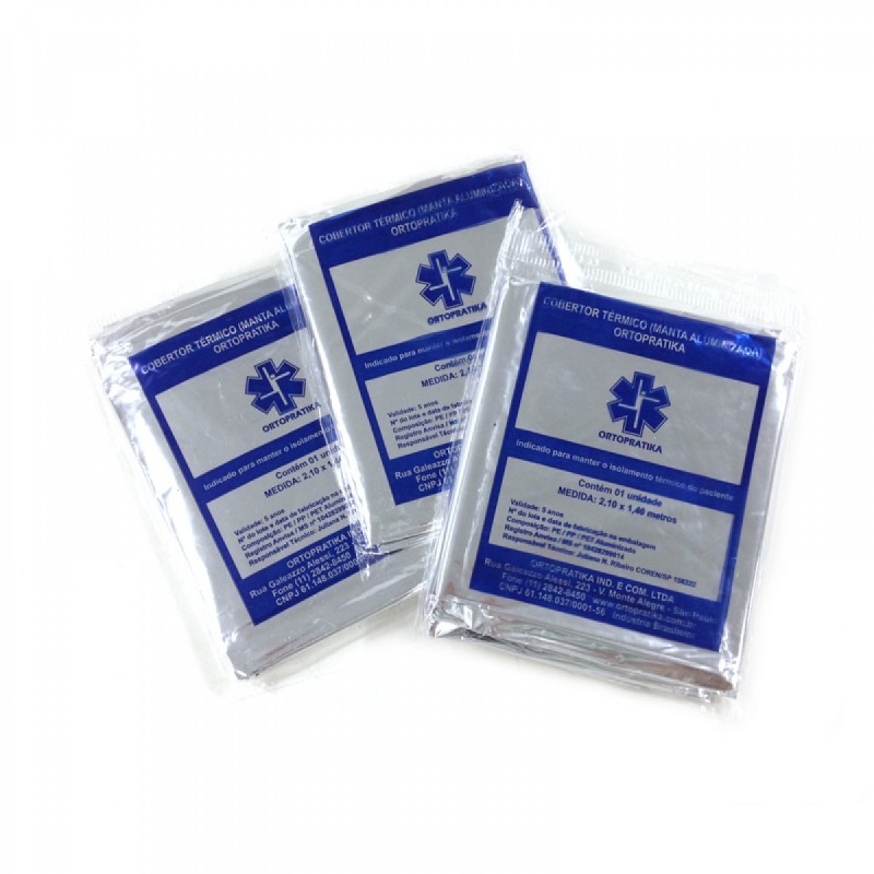 Cobertor térmico aluminizado utilizado para manutenção do calor corpóreo na prevenção do estado de choque ou queimaduras.