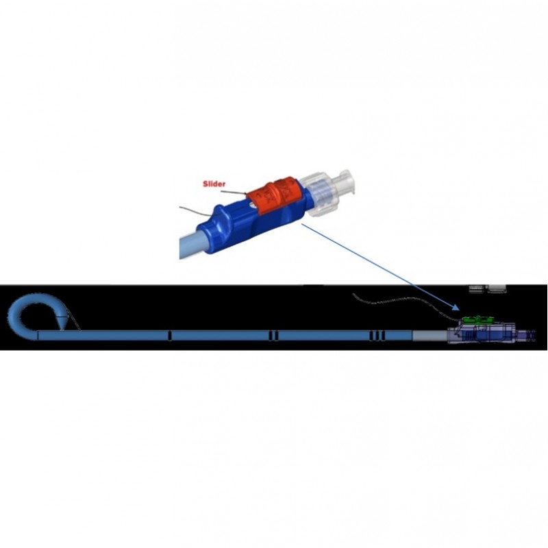 Sistema de trava de fio foi projetado para prender o pigtail e evitar que deslize o cateter para fora.
