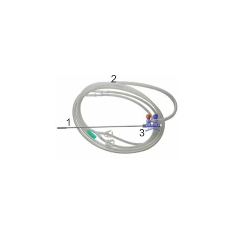 Fabricada em aço inoxidável com 5 mm de diâmetro e 8 orifícios na extremidade distal, conectada por rosqueamento a uma empunhadura de policarbonato que possui uma válvula ativada por mola e um tampão (pistão), ligada a uma mangueira dupla de PVC de 2.72 m que possui conexão universal para sistemas de drenagem e para conexão a 2 bolsas de infusão.