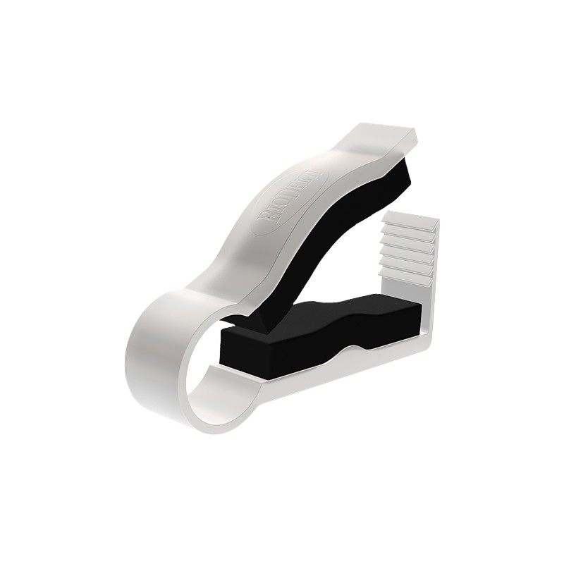 A extremidade aberta apresenta um arranjo de gancho para que a braçadeira possa ser apertada, se necessário. O dispositivo tem forros de espuma que entram em contato com o tecido do pênis para o conforto do paciente.