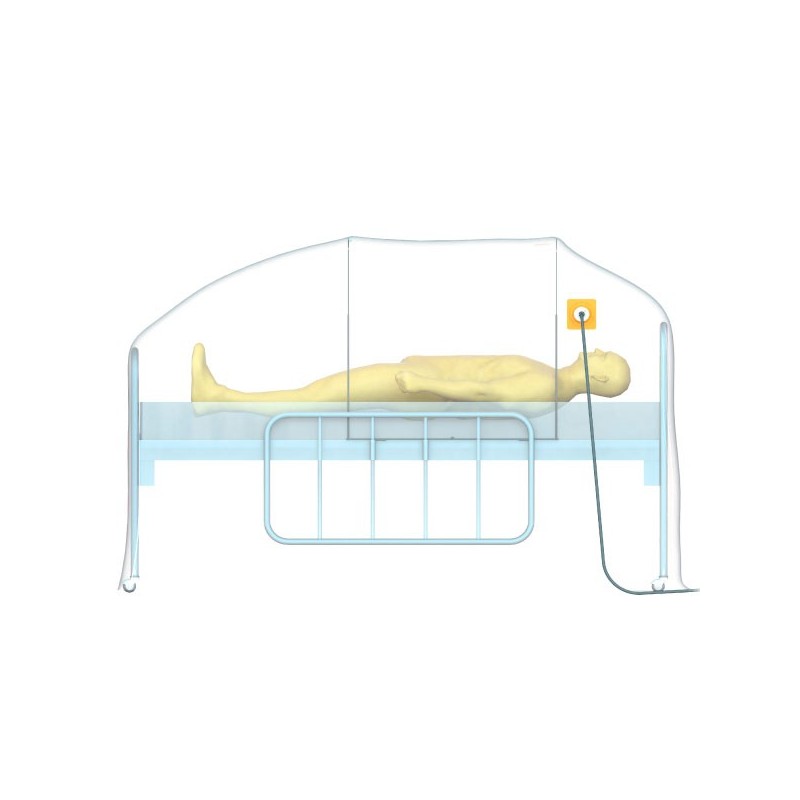 isolamento um acessório para realização de ventilação não invasiva (VNI) e oxigenioterapia de alto fluxo em pacientes com infecções respiratórias altamente transmissíveis. Isolando o paciente e assim reduzindo a dispersão de partículas virais no ambiente.