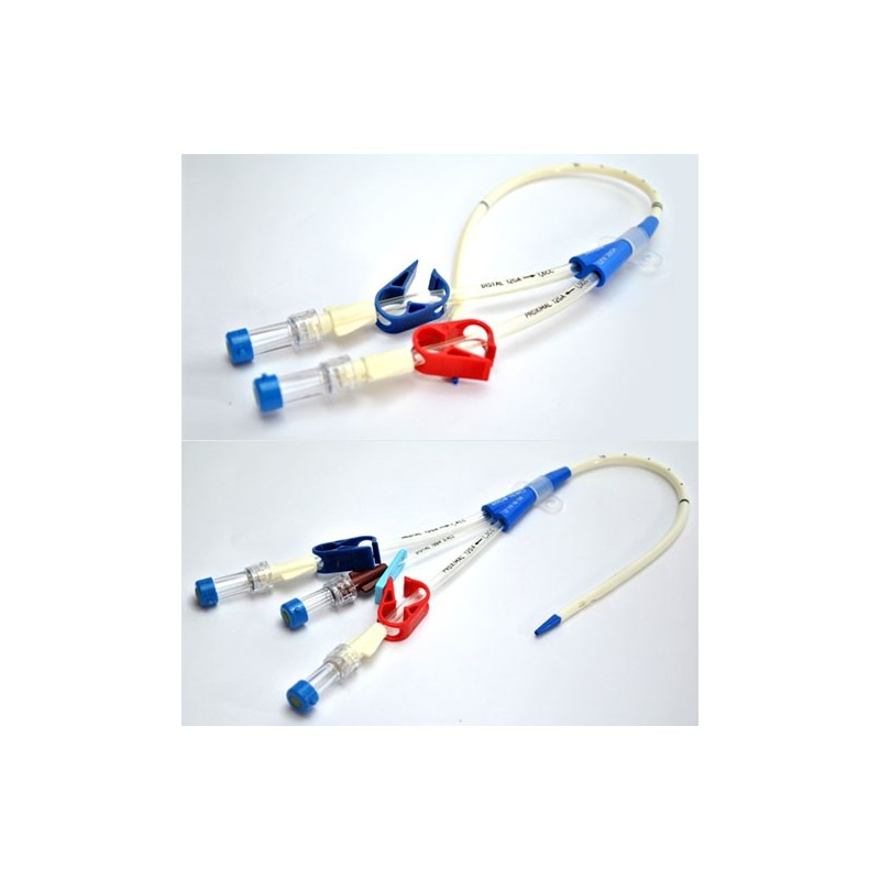 Cateter para hemodiálise em poliuretano II radiopaco, com ponta Blue Flex Tip®, seringa de Raulerson® sistema advancer de fio guia, clamp duplo de fixação do cateter, kit de punção (agulha, dilatador e fio guia)