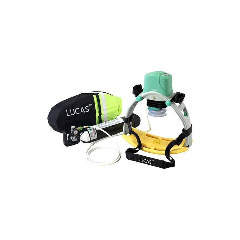 O sistema de compressão torácica LUCAS consiste em uma parte superior e uma placa traseira. A parte superior contém uma haste de pistão acionada pneumaticamente. Ele pode ser alimentado respirando oxigênio ou respirando ar de uma tomada de parede de hospital, ambulância ou de um cilindro.