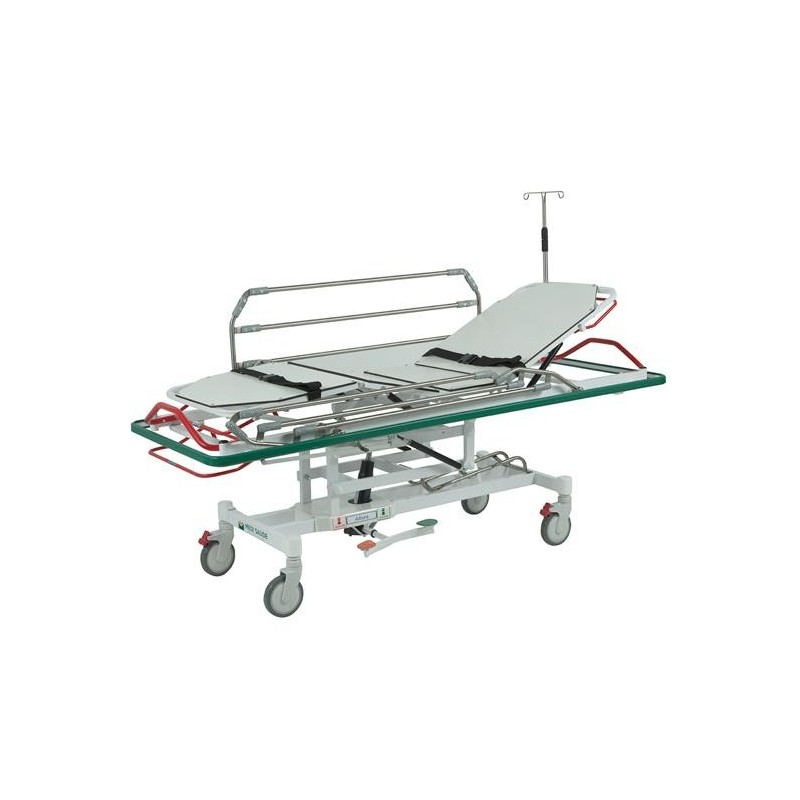 DESCRIÇÃO: maca hospitalar avançada, com altura regulável por sistema hidráulico a pedal, leito com 04 segmentos confeccionado em PEAD (polietileno de alta densidade) que proporciona osmovimentos do leito através de sistema pneumático e sistema hidráulico acionado por pedal. O conjunto é montado sobre quadro com travessas estruturadas em aço tubular quadrado, a base é confeccionada em tubos 30x50mm x 1,5mm e 3mm de espessura de parede. A maca hidráulica apresenta grades de proteção laterais em aço inoxidável, que proporcionam segurança ao paciente, e fácil acionamento ao operador. sua base tubular é dotada de rodízios giratórios de 5”, com freios diagonais, apresentando carenagem protetora da base confeccionada em fiberglass com acabamento em gel coat isoftálico.