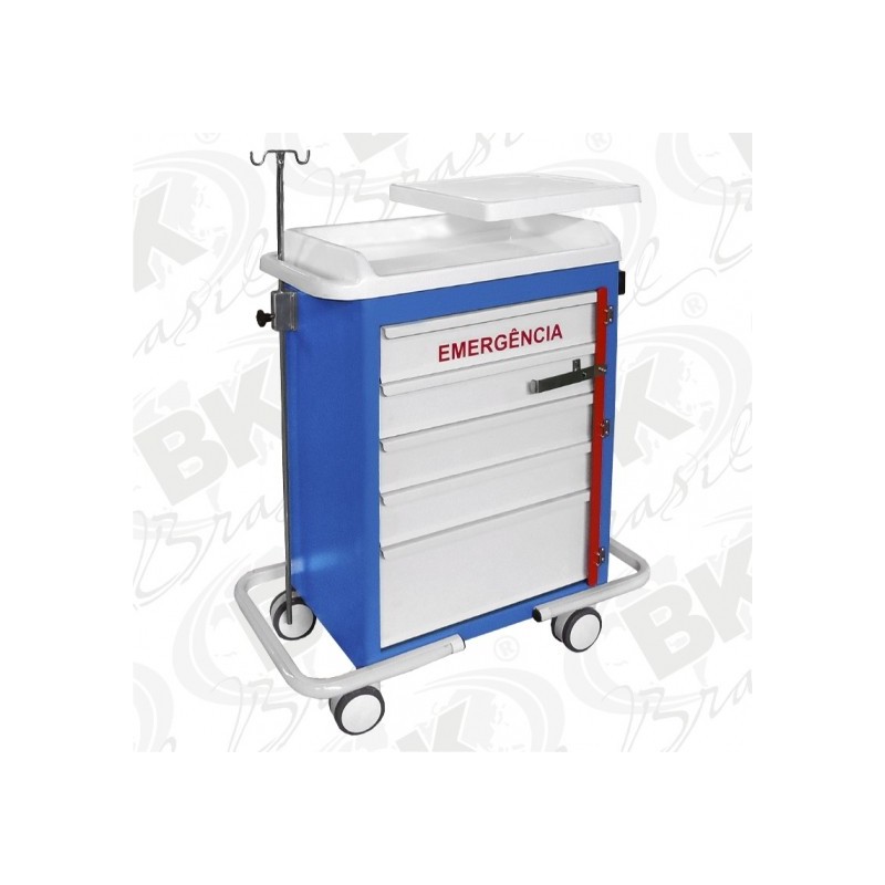 O CARRO DE EMERGÊNCIA BKCE 003 apresenta gabinete em chapa aço com cantos arredondados dotado de 05 gavetas; recebe acabamento com decapagem, jateamento e pintura eletrostática a pó com secagem em estufa. Gavetas dotadas de guias deslizantes telescópicas. Possui proteção em PVC contra impactos laterais e frontais e 04 rodízios banda de rodagem dupla com diâmetro de 04” e sistema de travamento.