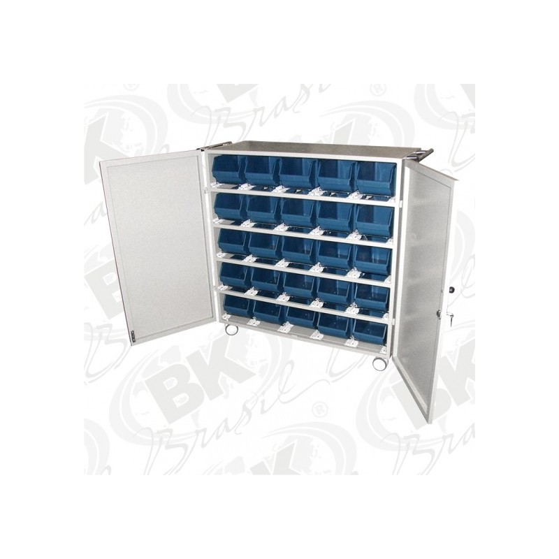 Confeccionado em chapa de aço 1020 espessura 1,2 mm, recebe decapagem, pintura eletrostática a pó e secagem em estufa. Composto de 25 compartimentos montados sobre guias telescópicas deslizantes. Porta com puxador em alumínio, estruturada com quadro em tubos 20x20. Dotado de 04 rodízios de 04”, sistema duplo rodado, com freios em diagonal. Dotado de sistema de fechadura com chave.