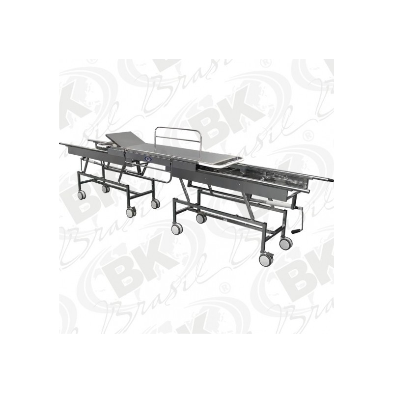- Composição do equipamento: composta por um leito deslizante e 02 cavaletes com altura regulável por sistema de manivelas em aço inoxidável AISI 304; apresenta sistema de acoplamento em poliacetal e varões de deslizamento em aço inoxidável AISI 304, e sistema de trava de segurança do leito, de funcionamento automático.